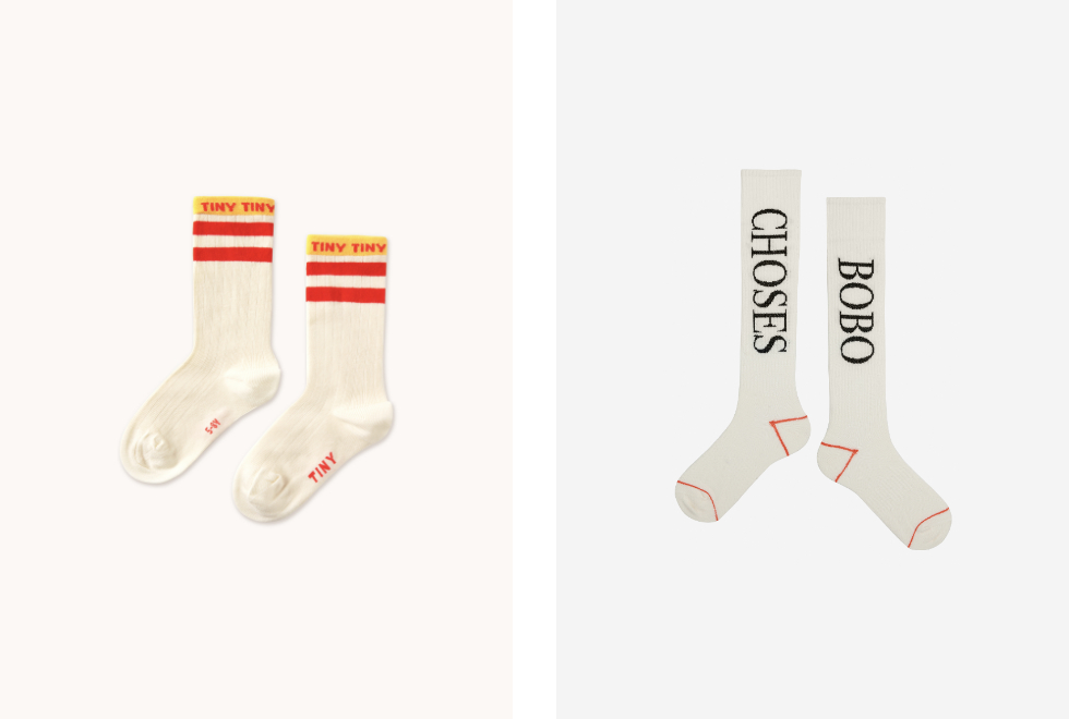 3. Skarpetki kremowe z czerwonym paskiem i logo, 4. Skarpetki extra długie Bobo Choses